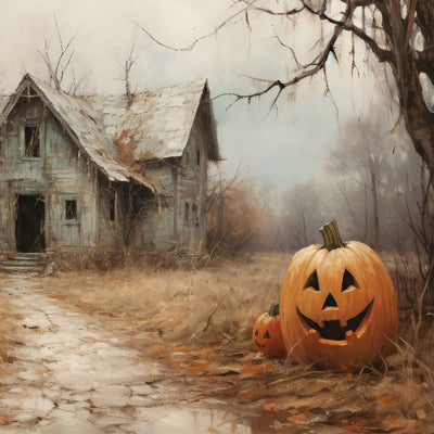 This Abandoned House Jack O'Lanterns picture feature a spooky jack o'lantern face carved on a pumpkin placed in front of an old abandoned house painted in a spooky Halloween-inspired picture. Perfect for adding a creepy touch to any Halloween décor.