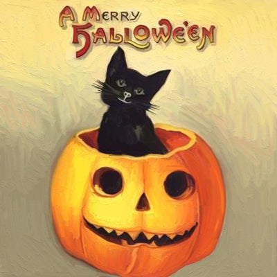 Hang up this vintage-style Halloween print of a black cat sitting in a classic orange jack-o-lantern for an instant Halloween décor addition to your home. The picture brings a unique and spooky touch to walls that guests will admire.