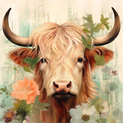 This quirky print features a playful Highland cow adorned with colorful flowers. Bring a touch of whimsy to any space with this charming painting. (No more moo-sery in your home decor!)