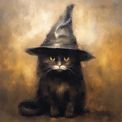 Enhance your Halloween decor with this charming print of a black cat wearing a witch hat. Perfect for cat lovers and all those who want to add a touch of whimsy to their home. This unique picture will bring a playful and spooky element to any room.