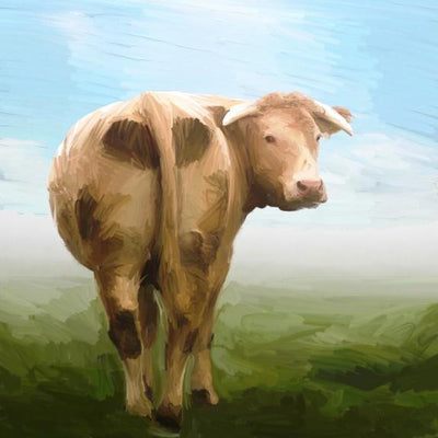 This picturesque print of a Cow Looking Back is a treasured memory of life on the ranch. With pleasing colors, you are taken back to life on the farm enjoying a sunny day in the pasture.