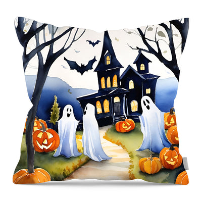 ThisHappy ghosts pillow is printed on a 16" square pillow. This is the same image available framed. It is polyester linen style material. There is a hidden zipper for ease of washing. Our pillows come stuffed and ready to use if you add a pillow insert