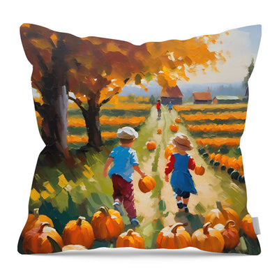 This Kids picking their pumpkins pillow is printed on a 16" square pillow. This is the same image available framed. It is polyester linen style material. There is a hidden zipper for ease of washing. Our pillows come stuffed and ready to use if you add a pillow insert