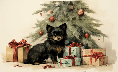 Enjoy a cozy Christmas with this vintage painting of a little dog with presents. Bring the festive spirits to your home with this charming picture.