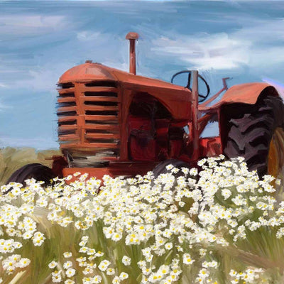 An old tractor sits amidst a sprawling daisy field, its worn metal exterior harmonizing with the vibrant blooms that surround it. The tractor stands as a testament to a bygone era, a relic of hard work and rural heritage. Against the backdrop of daisies dancing in the breeze, it exudes a sense of nostalgia and rustic charm.