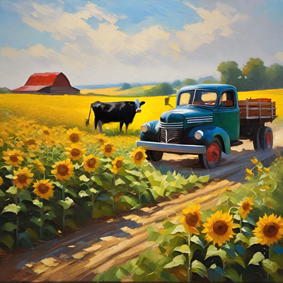This beautiful painting features an old truck, a black cow, and sunflowers in front of a barn in the background. It is a perfect wall decoration to give any room a rustic and cozy country feel.