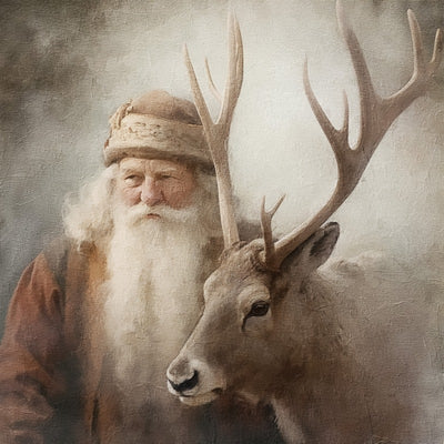 This festive Old World Santa portrait features a stylized depiction of jolly St. Nicholas, artistically rendered in muted colors reminiscent of bygone eras. Perfect for bringing holiday cheer to any wall.