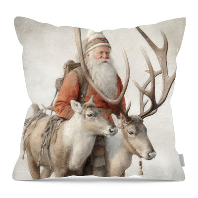 This Old world Santa with reindeer pillow is printed on a 16" square pillow. This is the same image available framed. It is polyester linen style material. There is a hidden zipper for ease of washing. Our pillows come stuffed and ready to use if you add a pillow insert