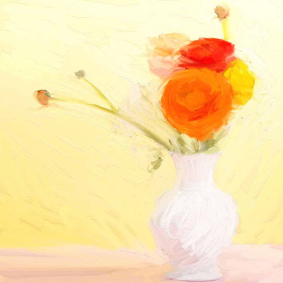 In a white vase, a stunning arrangement of orange ranunculus commands attention. These radiant flowers, with their layers of delicate petals, create a striking contrast against the pure white vessel. The orange ranunculus symbolize enthusiasm, joy, and the vibrant energy of life. They infuse any space with a burst of color and positivity, elevating the ambiance to one of warmth and delight.