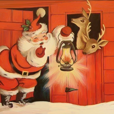 Greet the holiday season with vintage style! This festive Santa with reindeer painting is the perfect way to bring a jolly touch to your home. Get the classic, cozy feeling of Christmas with this decorative picture, featuring a stable and the classic "Santa and reindeer" pairing, sure to bring holiday cheer without fail! Ho ho ho!