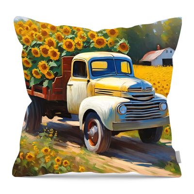 This Sunflowers to Market pillow is printed on a 16" square pillow. This is the same image available framed. It is polyester linen style material. There is a hidden zipper for ease of washing. Our pillows come stuffed and ready to use.