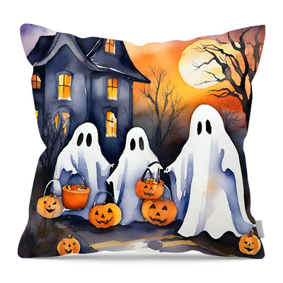 This Trick or treating ghosts pillow is printed on a 16" square pillow. This is the same image available framed. It is polyester linen style material. There is a hidden zipper for ease of washing. Our pillows come stuffed and ready to use if you add a pillow insert