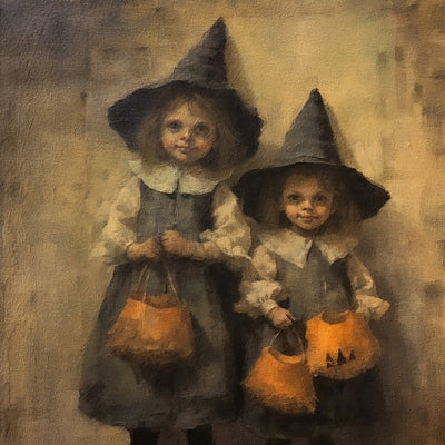 Get spooky with our Trick or Treating Witches print! Perfect for adding a touch of whimsy to any room and casting a spell of delight on all who see it. Don't miss out on this spellbinding addition to your home.