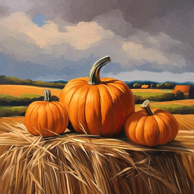 This beautiful painting showcases a trio of pumpkins resting on a bed of hay, perfect for any home with an autumnal vibe. Its rich, vibrant colors and precise detail make it an eye-catching addition to your wall. A perfect choice for anyone hoping to add a touch of seasonal cheer to their home.
