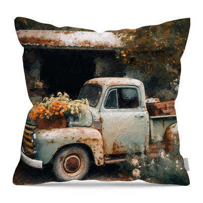 This Truck with Flowers pillow is printed on a 16" square pillow. This is the same image available framed. It is polyester linen style material. There is a hidden zipper for ease of washing. Our pillows come stuffed and ready to use if you add a pillow insert