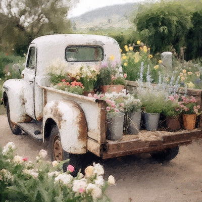 Introducing the White Flower Truck, featuring a country scene. With its eye-catching design, it can add a touch of nature and serenity to any room. Perfect for those who appreciate art and the calming ambiance of flowers.