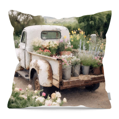 This White Flower Truck pillow is printed on a 16" square pillow. This is the same image available framed. It is polyester linen style material. There is a hidden zipper for ease of washing. Our pillows come stuffed and ready to use if you add a pillow insert