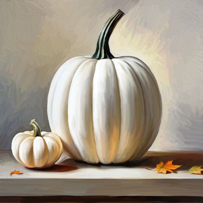 This stunning White Pumpkin Still Life painting is the perfect way to bring the beauty of Autumn into your home. The two white pumpkins featured have been captured in detailed brush strokes in this painting. Bring a touch of sophistication and tranquility to your wall space with this beautiful painting.