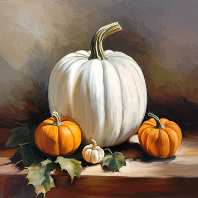 This beautiful painting of white and orange pumpkins on a table will bring a cheerful touch to any room. Perfect for sprucing up a space, the vibrant colors of the pumpkins will create a warm atmosphere.