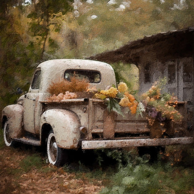 Get ready to hit the road in style with our White Truck in Autumn picture! This eye-catching print boasts a white truck, packed with flowers and ready to go. Add this to your home's Autumn Collection today!
