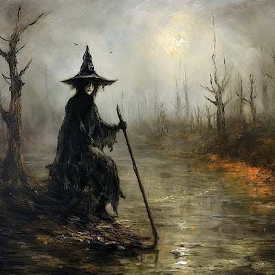Explore a mysterious path with this gorgeous painting of a witch. Featuring a foggy path filled with trees in the distance, this artistic piece is sure to bring a touch of magic to your home.