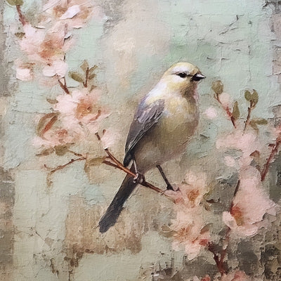 This yellow bird with blue wings is depicted in a beautiful painting that captures the essence of nature. The detailed picture showcases the bird perched on a branch, adding a touch of serenity to any room.